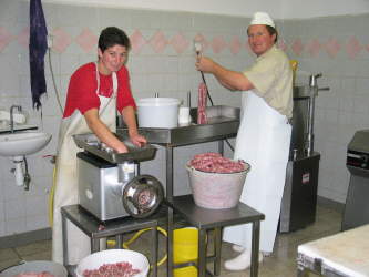 De worstmakerij in vol bedrijf. |